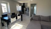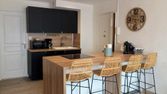 Et aussi d'une cuisine intégrée, équipée de réfrigérateur, plaque de cuisson vitro ou induction, micro onde grill. Toute la vaisselle, casseroles, plats,,, est fournie