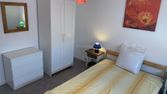 La chambre est meublée avec lit, une étagère, table/bureau avec chaises.