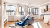 - armoire dressing, étagère, table, chaise, lampe de chevet, fauteuil avec coussin.