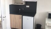 Le logement n°2 de 18m² en rdc contient une kitchenette (buffet, plaque vitro, hotte, frigo, micro-onde & vaisselle ) d'une pièce de vie comprenant canapé lit, table & chaises, meuble TV + téléviseur, penderie
