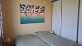 Chambre de 12M2 avec un grand placard, un lit futon de 140X200 avec literie, un siège en rotin et deux table…