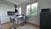 - 1 grande pièce à vivre avec un coin salon, un coin séjour et cuisine américaine contemporaine de qualité avec hotte 90cm + plaques vitrocéramiques