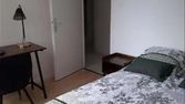 Propose une chambre meublée (lit simple, bureau, armoire, chaise vue sur le jardin…) 21 m². Style blanc/bois rustique, tu n’as plus qu’à poser tes affaires.