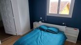 La chambre est équipée d'un lit 140x190 ainsi qu'un bureau + fibre via ethernet + tv + Bz. Rangements inclus (penderie + étagère) + étendoir pour la serviette de douche.
