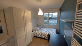 La chambre fait 12 m2. Elle est meublée avec un lit double, un bureau, une étagère, un placard est inséré pour ranger ses affaires personnelles.