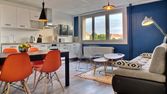 Une cuisine entièrement équipée (four, plaques, frigo, micro-ondes, machine à laver) ainsi qu’un espace repas avec table et chaises