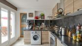 Cuisine lumineuse de dix mètres carrés avec de tout pour cuisiner, réchauffer, stocker… deux wc et une salle de bains à partager avec 4 locataires, je vis au rez de chaussée de façon autonome. En 2016, il y a eu une grande rénovation, avec l'isolation maxi, et la déco refaite.