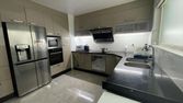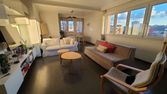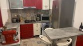 Salle de bain, wc, cuisine ouverte et espace repas/salon en commun.