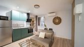 Cuisine équipée, réfrigérateur/congélateur, lave vaisselle, four + micro-ondes, cafetière, grille pain,…
