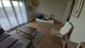 Le salon est spacieux et équipé d'un canapé confortable, une télé écran plat, table basse et table à manger avec 4 chaises. Il donne sur un balcon filant sur cour.