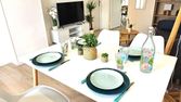 - Un grand séjour / salle à manger avec canapé, fauteuil, télé,