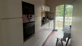 Une cuisine de 14m2 semi-équipée : cuisinière vitrocéramique, four et placard de rangement,