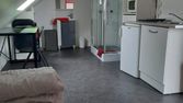 - Cuisine : frigo + four micro onde + four + bouilloire, tasse, bol, verre, assiette couverts, bassine, table, chaises