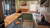 🍽️ Cuisine moderne équipée (lave-vaisselle, lave-linge, frigo, congélateur, plaques, hotte) + coin repas.