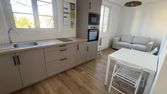Une entrée sur un séjour, cuisine aménagée et équipée ( plaque de cuisson, hotte, four, placard buanderie), une chambre lumineuse, un bureau, salle d'eau et WC séparés.