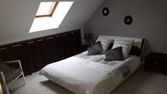Chambre 2: 11m² donnant sur résidence calme (lit, table de nuit, dressing, rideaux occultant la lumière).