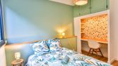 12m2 dont 3 m2 avec balcon, d'une coiffeuse/bureau, armoire, lit 1 place transformable en 160×200.